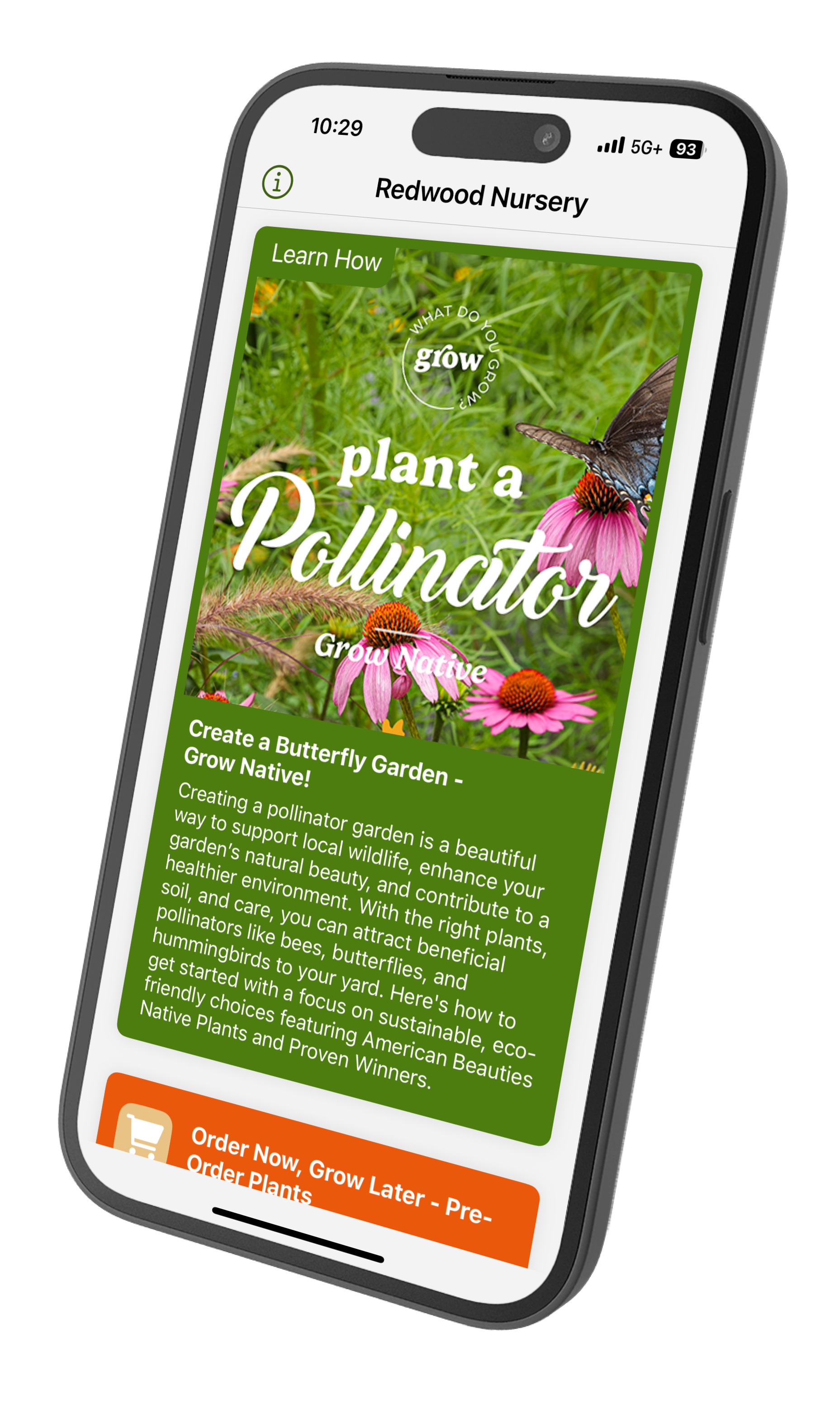 Stay connected with exclusive gardening tips, seasonal promotions, and rewards through the Redwood Nursery app. Get $10 off purchases over $65 with promo code WELCOME24 when you download today!