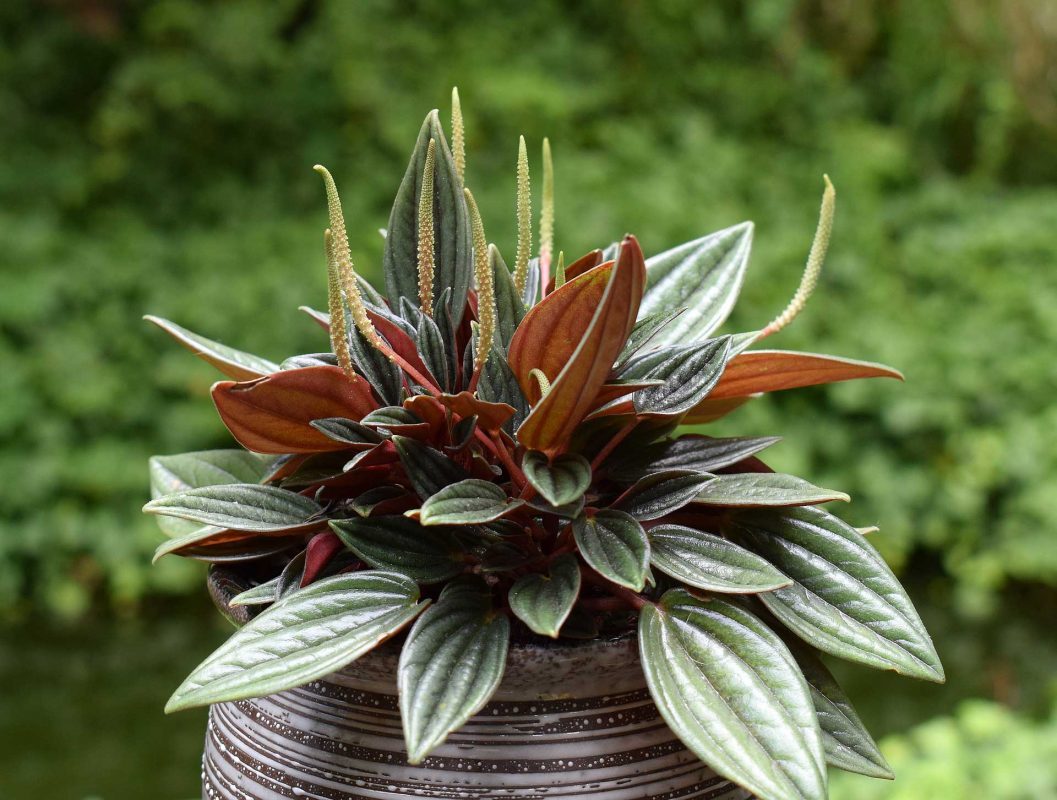 Peperomia is a compact little plant that does well with a moderate amount of light. The low-growing, bushy foliage comes in a wide range of colors and shapes. Peperomia argyreia (watermelon peperomia), for instance, has fairly large leaves and a pattern resembling watermelon rinds while Peperomia clusifolia‘s leaves have pink edges. Peperomia griseoargentea’s leaves are dark green with deep veins that create interesting texture.