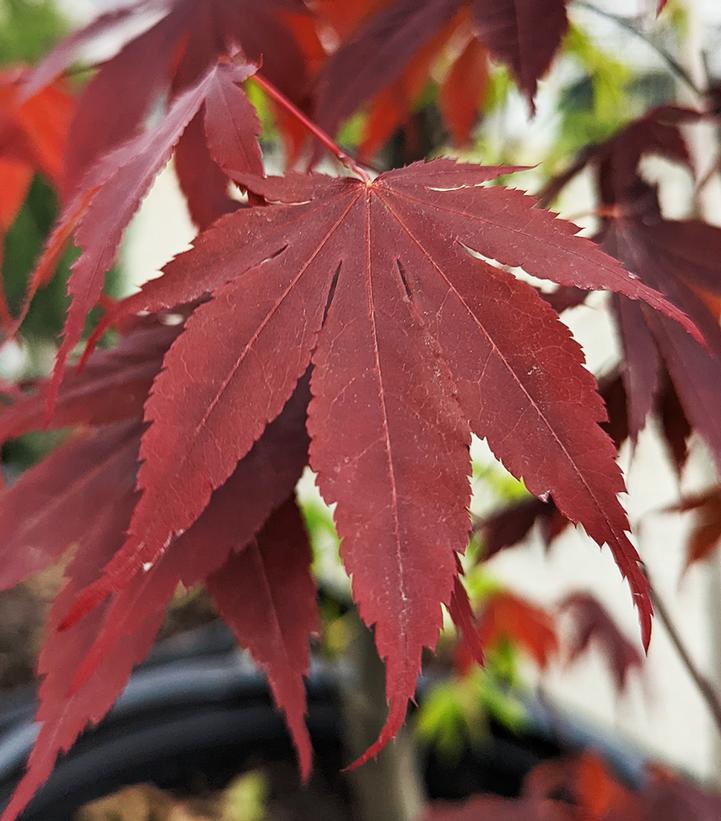 This tried and true Acer palmatum remains a distinguished landscape favorite. ‘;Bloodgood’; is a problem-free specimen and a hardy, vigorous grower capable of providing up to 20′; of symmetrical, rounded branching. It is a multi-stemmed small tree that shows off enchanting silvery bark, attention-grabbing crimson stems and deep burgundy star shaped leaves, all of which perfectly enhance the notable natural grace of this popular specimen. Non-dissected leaves hold their rich color all summer long, making it perfect for a patio or as a small shade tree and the show continues through autumn and winter, when the deep red foliage turns flaming scarlet before dropping to expose the shimmering gray bark that sparkles against snow. ‘;Bloodgood’; grows well in sun or shade, but for best performance provide afternoon shade and keep its roots cool.