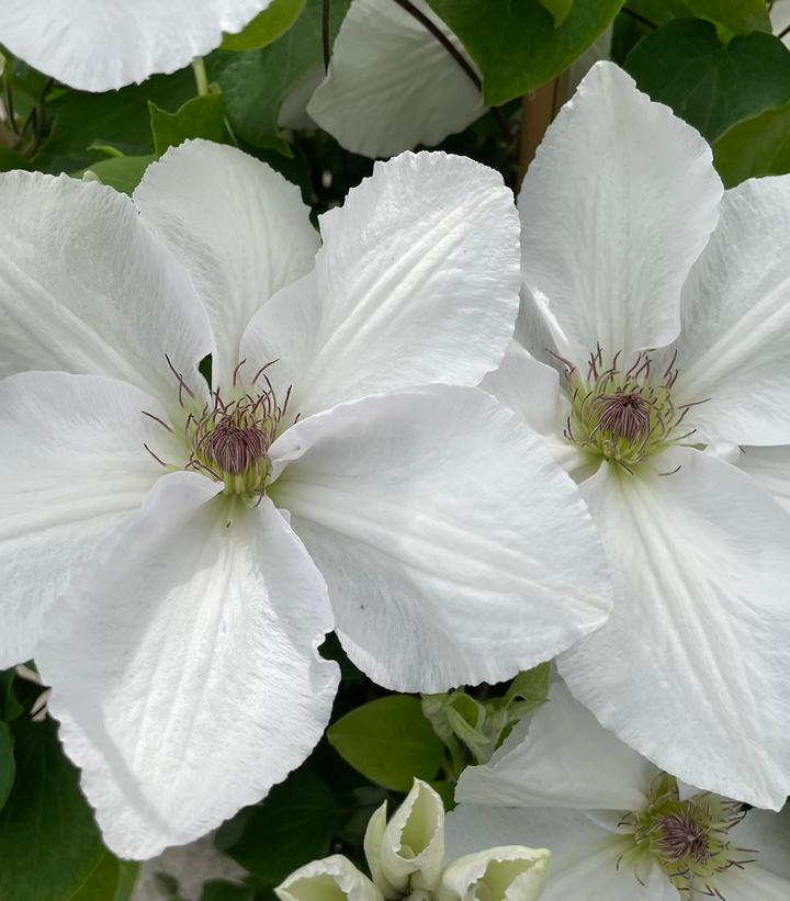 The exquisite large star-shaped, pure white robust flowers some 12-14cm across, with red anthers, are formed from May through to July, clothing the plant from base to tip. Reliably repeat flowers into September. Guernsey Flute would make a wonderful addition to a patio, in a container, or in the mid to front of a flower border, where it’;s longevity of individual blooms and successive flowers can be fully appreciated. This exceptional clematis has an unusual but endearing trait of holding, just open flower buds, for an extended period, almost like a champagne flute, hence the use of ‘;flute’; in its name. When flowers mature they open fully flat, with pointed sepals and of generous proportions. Possibly the most robust flower of any white form of large flowered hybrid clematis.