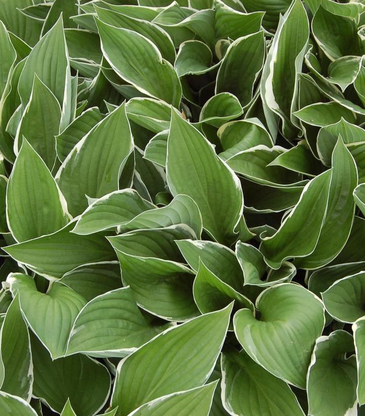 Description: Heart-shaped, dark green leaves with white margins Lavender flowers in August