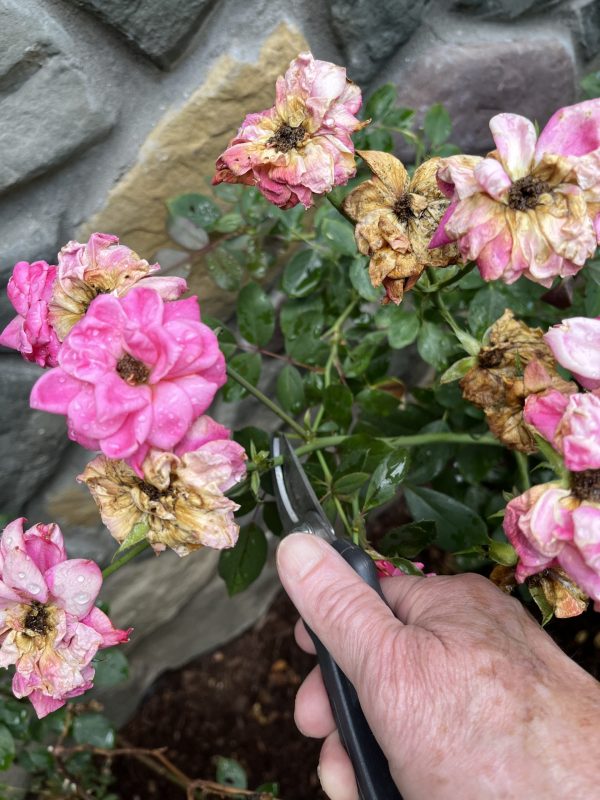 - Identify spent flowers: Remove blooms that are faded, wilted, or beginning to form hips.